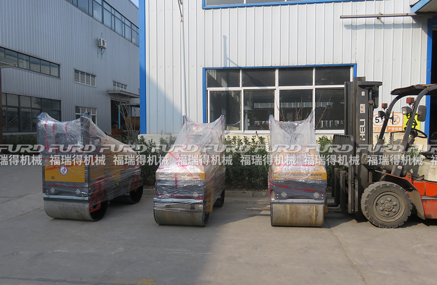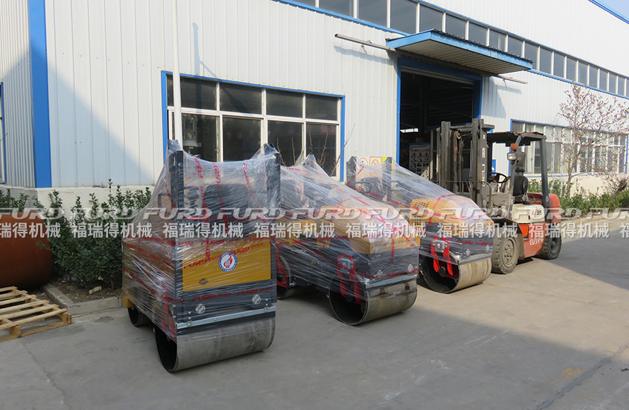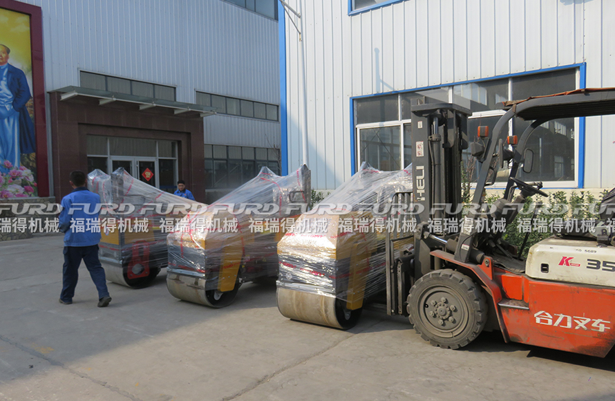 3月26日,福瑞得機械3臺座駕雙鋼輪壓路機打包發往浙江。