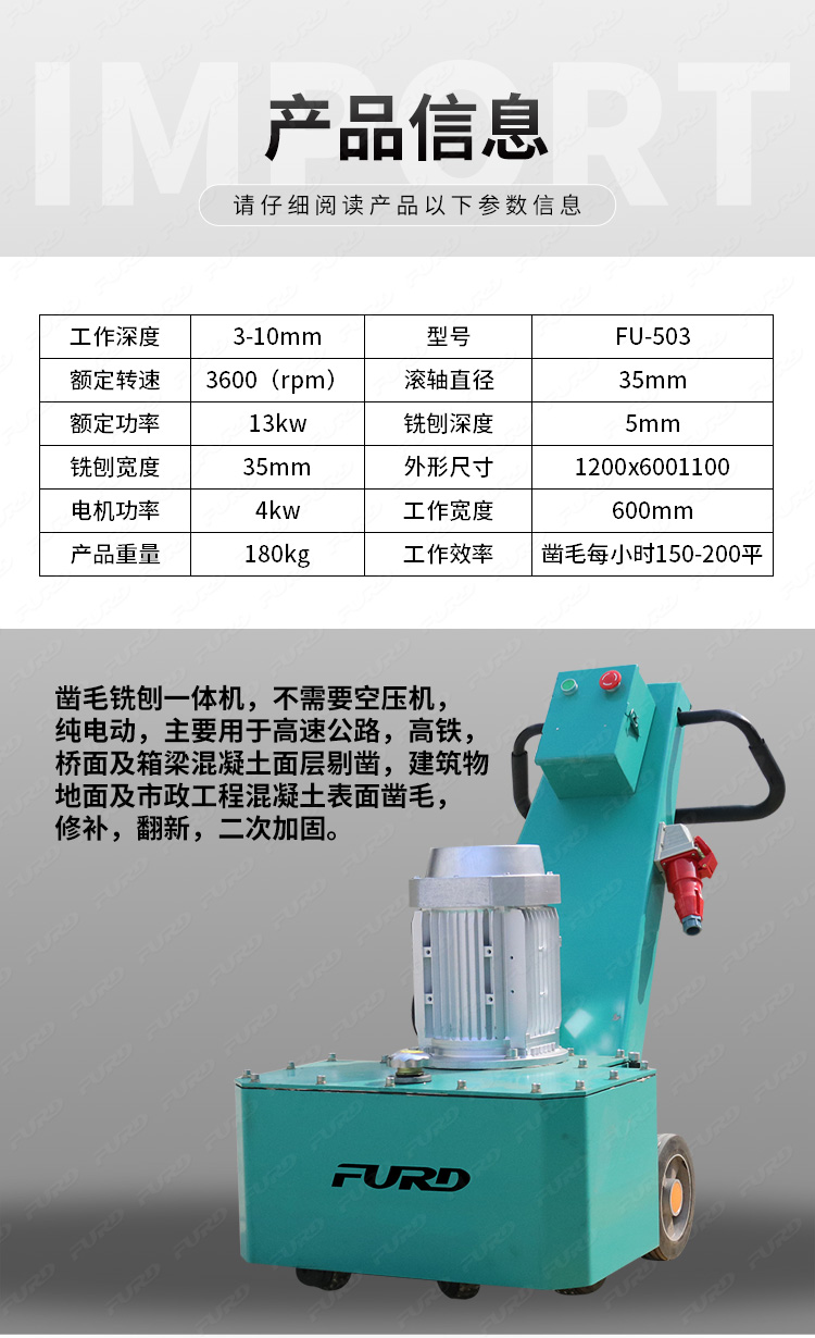 銑刨鑿毛一體機同時具備了銑刨機和鑿毛機這兩個機器設備的功能,不但效率高而且為您節省費用,提高工作效率!該機器可以用于高速公路、高鐵、橋面及箱梁混凝土層剔鑿,建筑物地面及市政工程混凝土表面鑿毛、修補、翻新、二次加固。