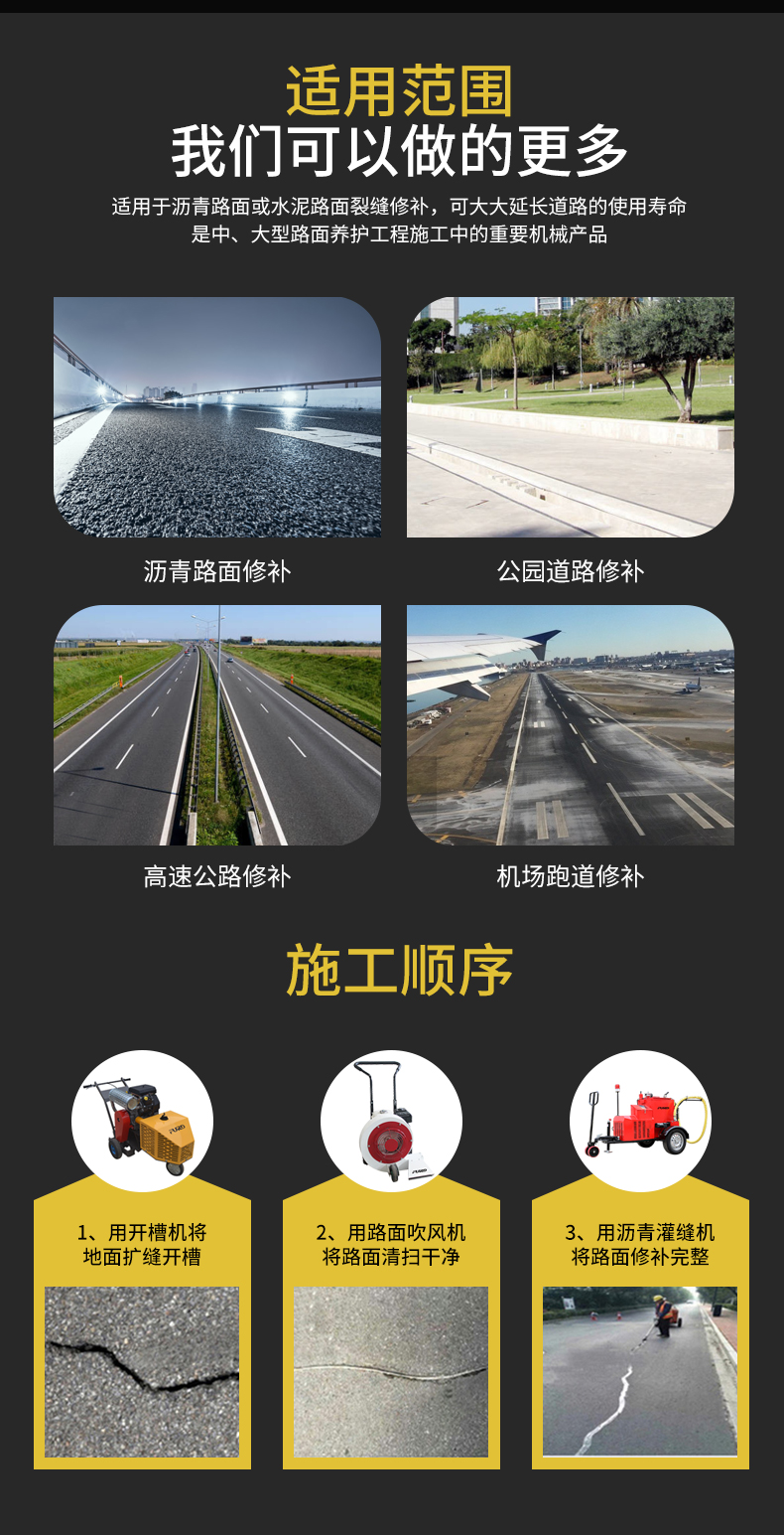 FGF-100瀝青灌縫機使用原料為瀝青灌縫膠,主要用于瀝青路面不規則裂縫、混凝土路面、橋梁伸縮縫、上下水道、煤氣管埋設機鋪裝路面的連結處防水處理,而專門設計、生產的瀝青補灌縫專業機械。