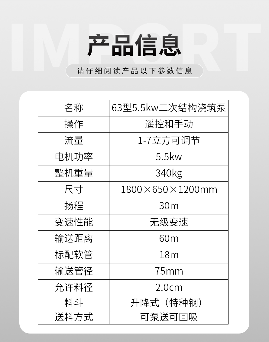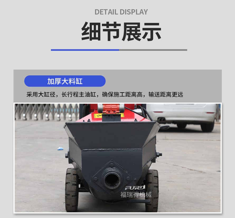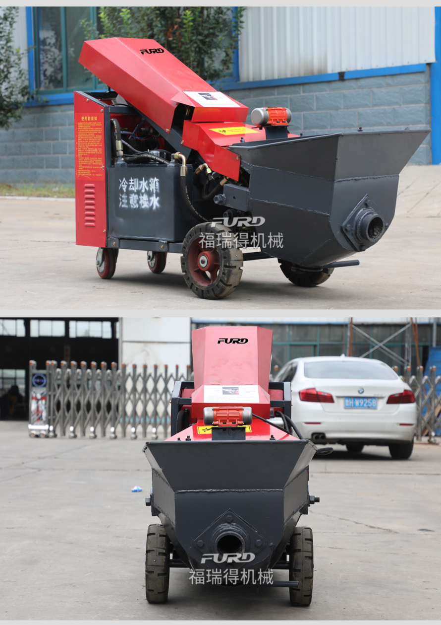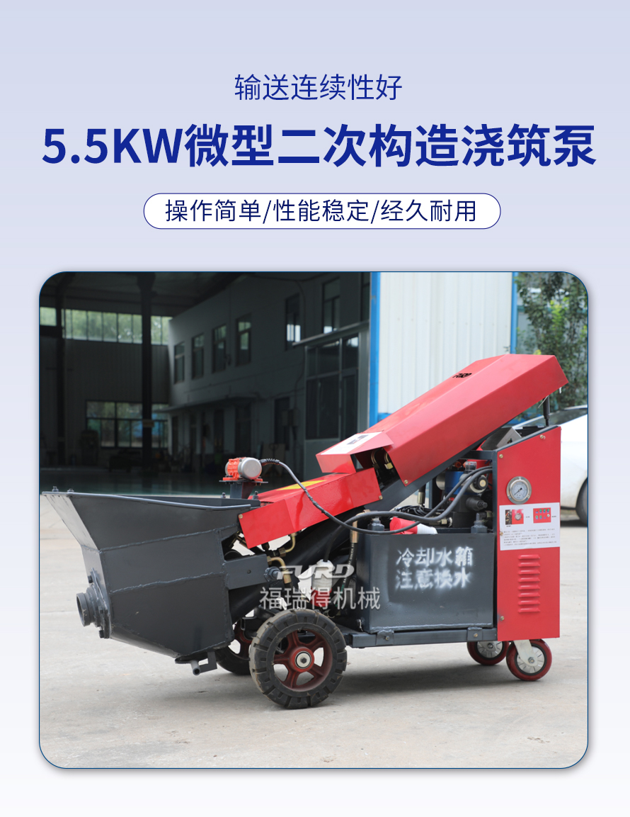 福瑞得二次結構澆筑泵適用于商品房、農村建房,打二次構造柱,圈梁等,是您澆筑的好設備。電機功率小,體積小,重量輕,料斗可升降,真正能提高您的施工效率,是人工澆筑的幾十倍。