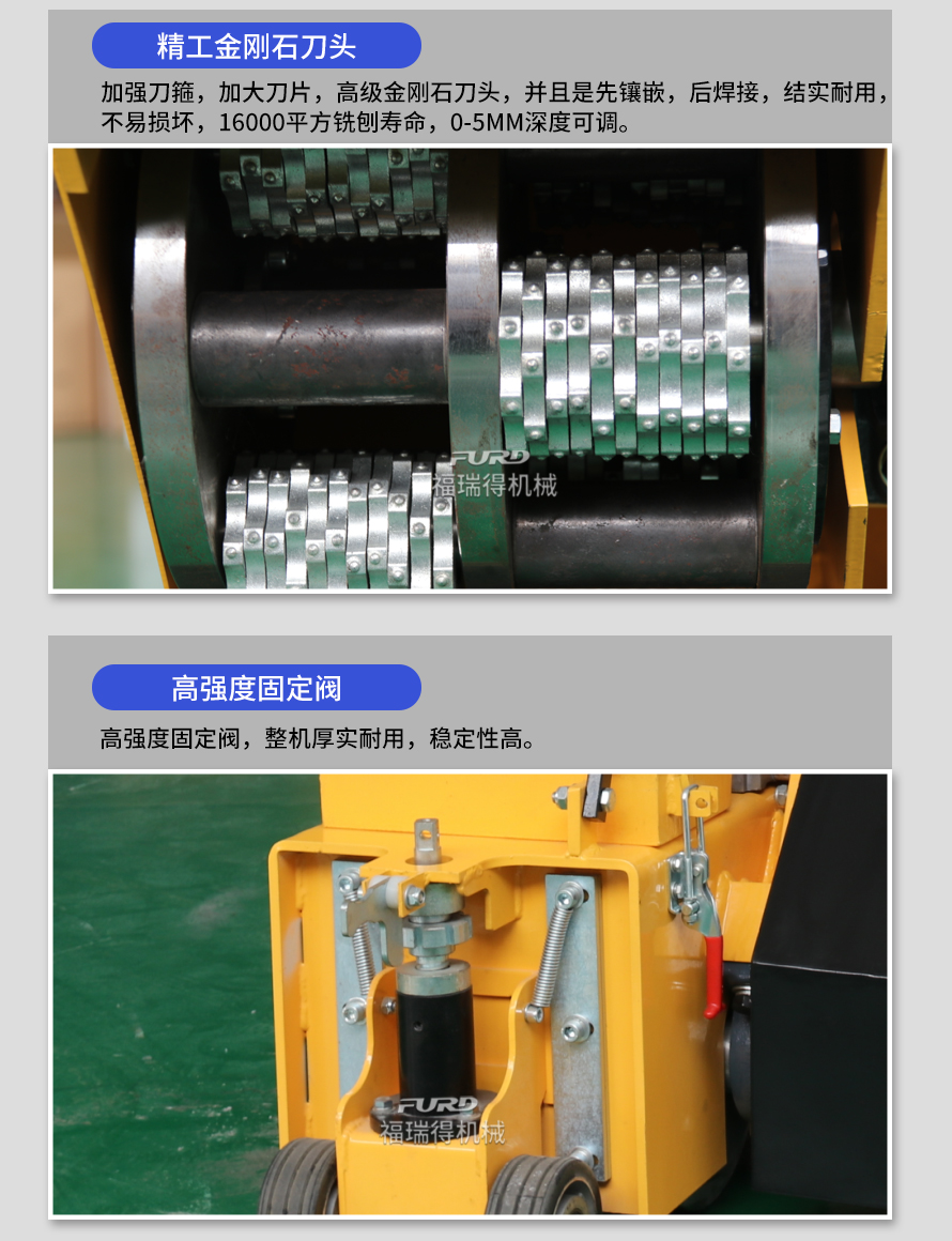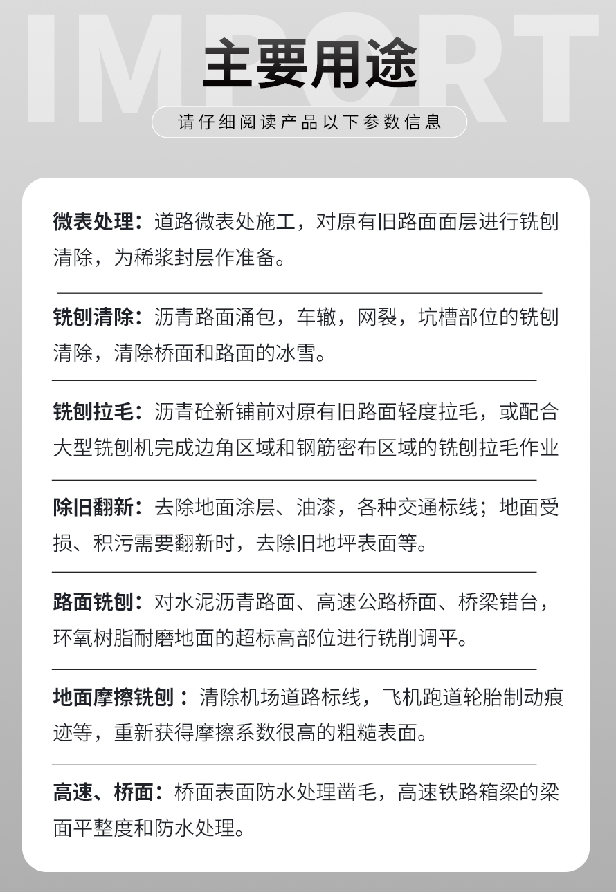 用于橋面鋪設(shè)瀝青或車(chē)間舊的混凝土地面重新攤鋪混凝土之前,清除水泥浮漿以及鏟平拉毛, 也用于清除建筑施工中的堅(jiān)硬灰渣。
