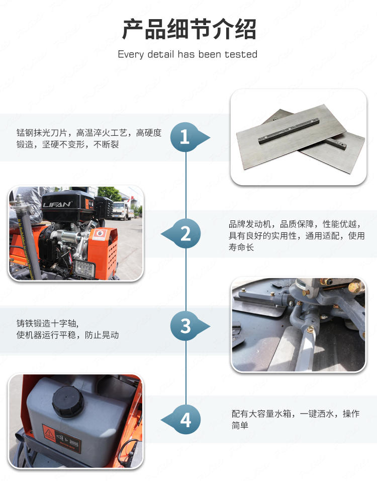 該機采用雙刀片,重量更重,對地面的壓實效果更好,比走后式動力泥鏟機效率更高。